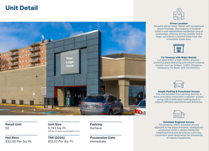 The Westgate Centre is an 85,000 Sq.Ft grocery anchored shopping plaza in a beautiful residential neighbourhood in Cambridge, Ontario. The shopping plaza is well tenanted with brands such as Sobeys, TD bank, Shoppers Drug Mart, LCBO, Tim Hortons, and Dollarama. The playful design and low-vacancy rates make this centre a prime destination for quality retail in the City of Cambridge.